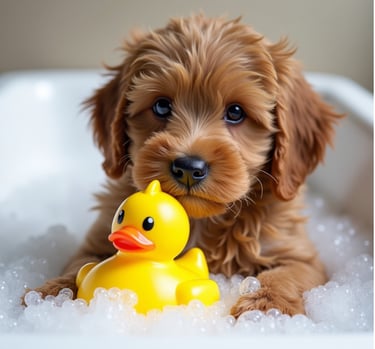 Giving a puppy their first bath and groom is such a special moment! I usually introduce this around 7-8 weeks to help them get comfortable with being cared for. I use warm water and a gentle, puppy-safe shampoo, keeping the bath short and sweet to make them feel secure. Afterward, a soft towel and low-heat blow-dry keeps them cozy. Trimming their tiny nails takes extra care—I use a small trimmer to avoid the quick. Lots of cuddles and treats make it a positive experience. I love watching them enjoy the process and grow into confident, happy pups!