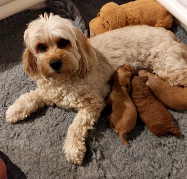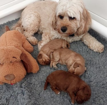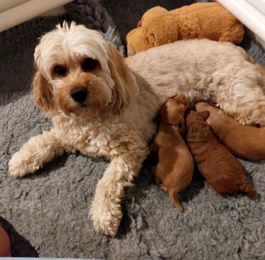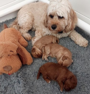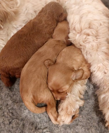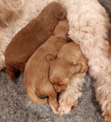 It’s still all about Poppet’s milk this week, but the pups are nursing with more vigour and efficiency. Their little bellies swell after each feed, and the post‑meal “milk comas” are a regular sight. Colostrum has done its job, and now Poppet’s mature milk is providing the perfect balance of nutrition for growth.