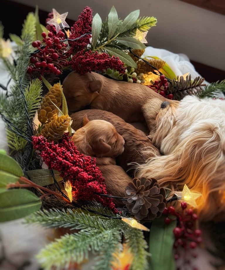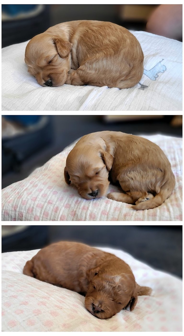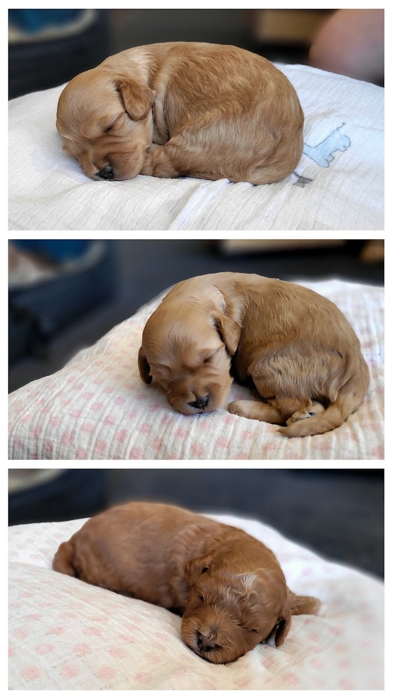 Teddy, who started life as the smallest at 164 g, has been the biggest surprise and is now 583 g, up 419 g. He was the first to start opening his eyes and is proving to be a feisty little explorer already. His apricot coat is soft and warm, and he feeds with the same quiet efficiency as the others before falling into a deep milk coma.