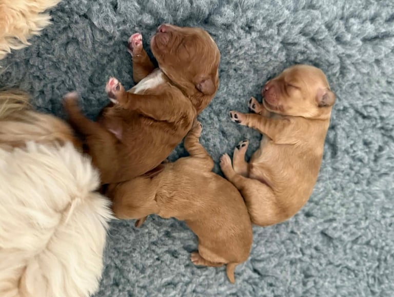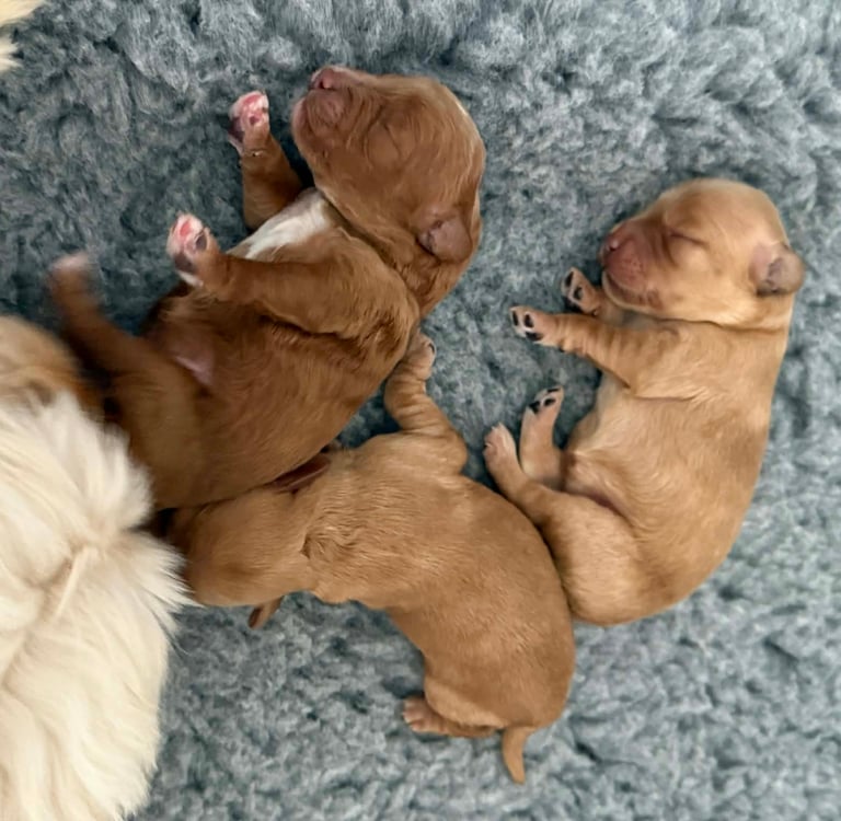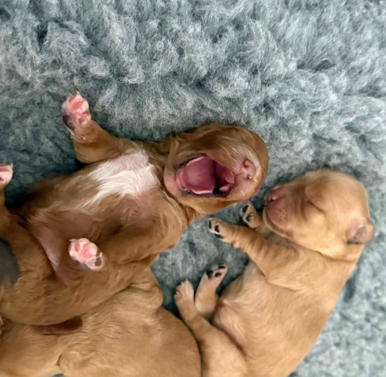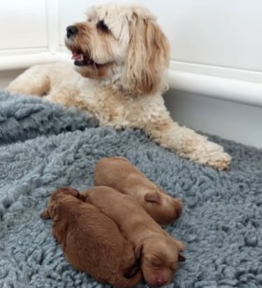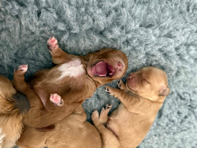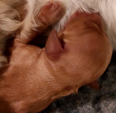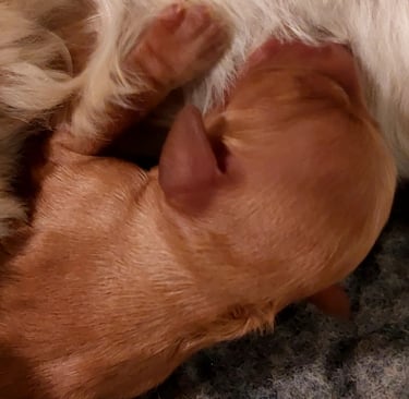 Teddy was the smallest at birth, weighing in at 182g, but he’s proving to be just as steady as the rest. His apricot coat is soft and warm, and he nurses with quiet efficiency. Often the smallest pup is the squeaky, spirited one, but Teddy is showing the same reliable, even‑tempered behaviour as his littermates. He’s catching up nicely in weight and seems perfectly content to follow the same rhythm as the others.