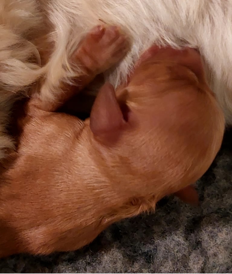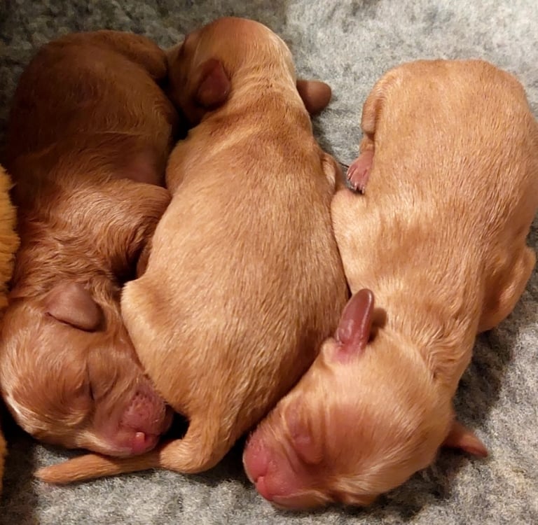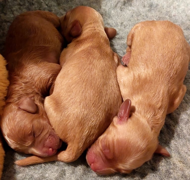 Winnie made quite the entrance, tipping the scales at 224g — the heaviest of the trio. Her father’s rich red colouring is already evident, setting her apart visually from her apricot siblings. Behaviour‑wise, though, she’s right in step with the others: calm, content, and consistent. While some pups in other litters might already be showing bold or bossy traits, Winnie is simply thriving alongside her siblings without standing out as dramatically different.
