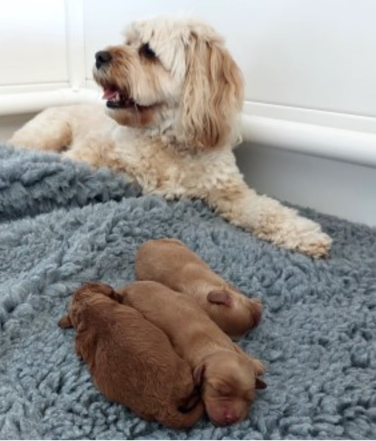 Jemima arrived at 220g, just shy of Winnie, and she looks set to inherit Poppet’s apricot colouring. She’s happiest snuggled close to mum, but when she wriggles forward to nurse, she does so with the same calm determination as Winnie and Teddy. While some pups might already stand out as the “gentle soul” or the “confident explorer,” Jemima is showing the same consistent, even‑tempered behaviour as her brothers.