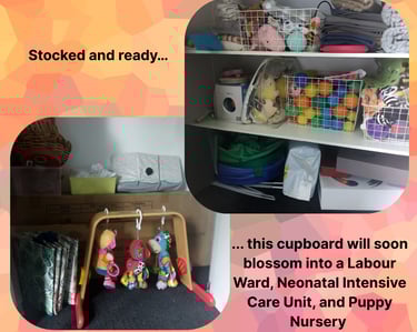 Alongside the theory, I’m running through my supplies like a backstage checklist. Towels, blankets, disinfectant, gloves, scissors, thread, a bulb syringe, and a heat source are all gathered and checked twice. Puppy scales and coloured ribbons are ready for identifying the cast as they arrive, and my notebook is waiting to record birth times, weights, and those first precious details.